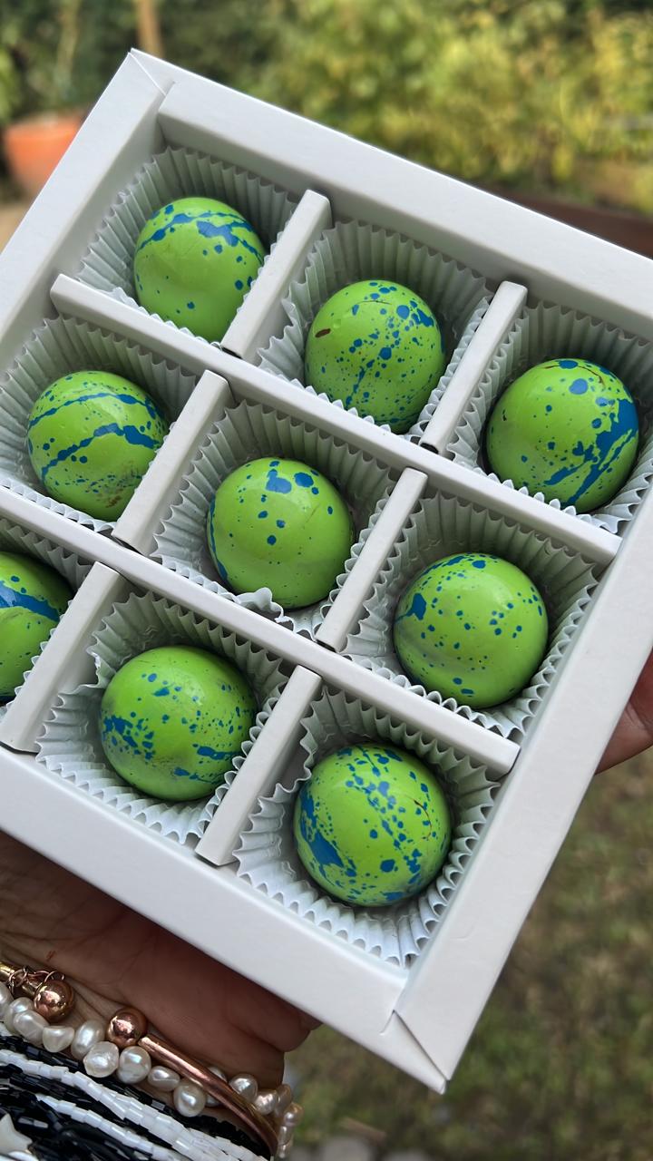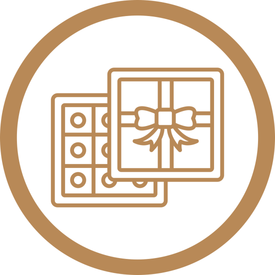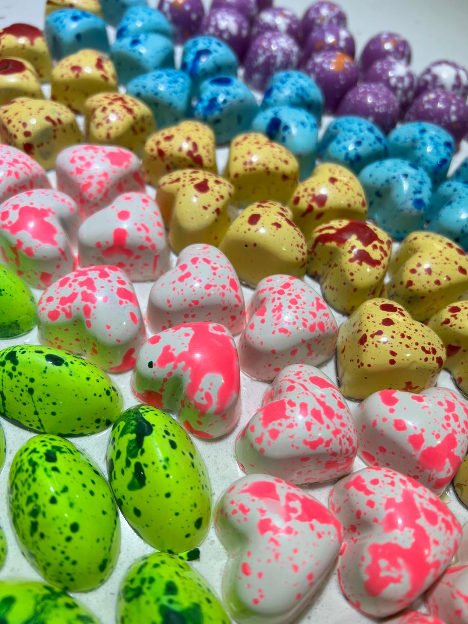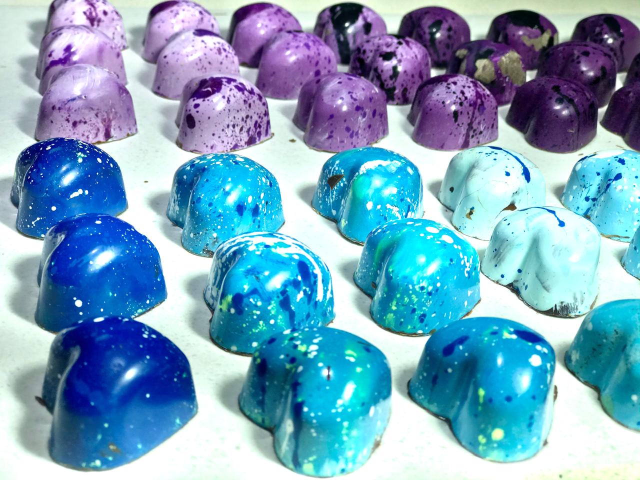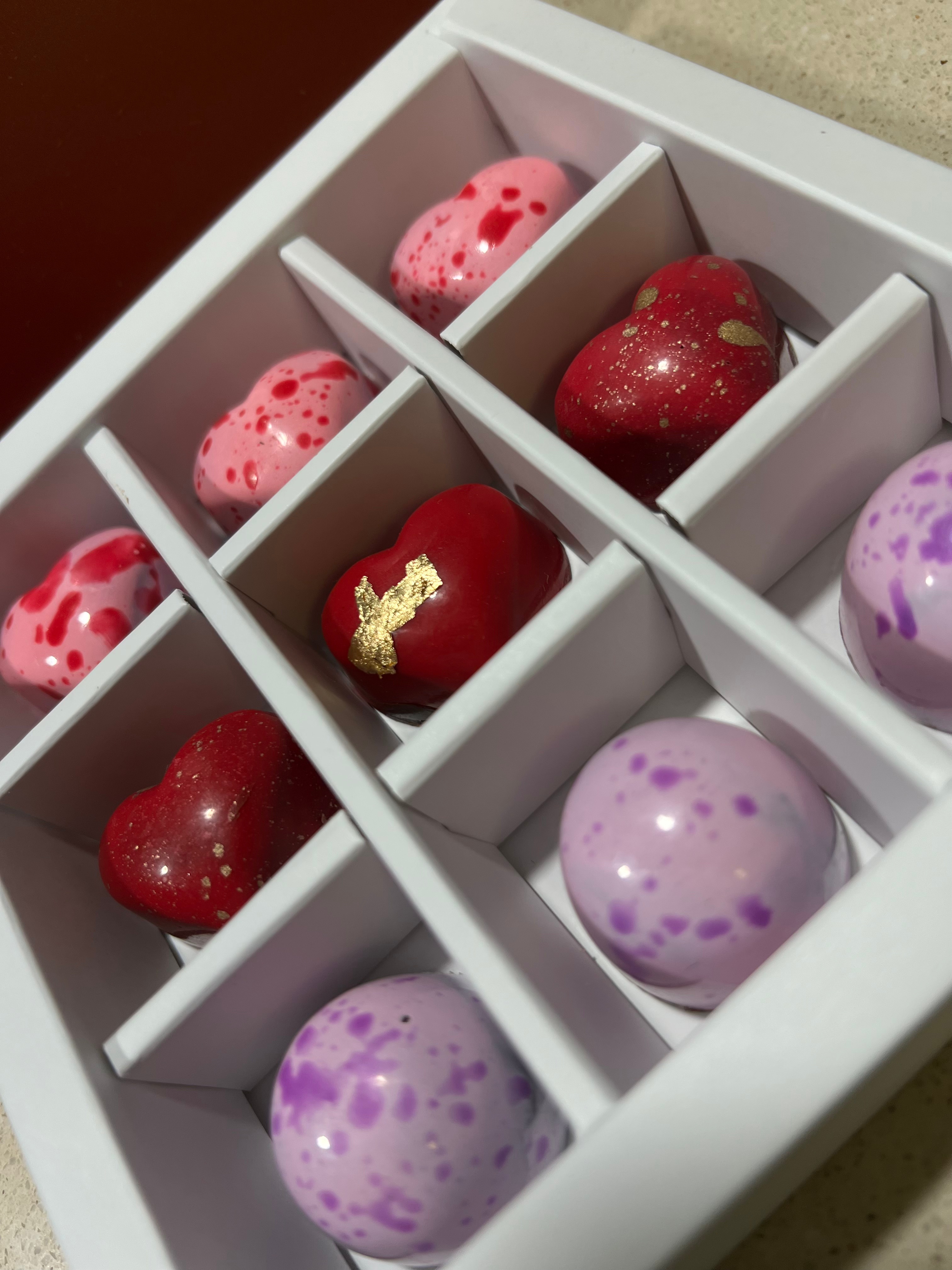 - Rellenos en ganache con ingredientes naturales. Frutos rojos, pistacho, chocolate afrutado, vainilla – caramelo